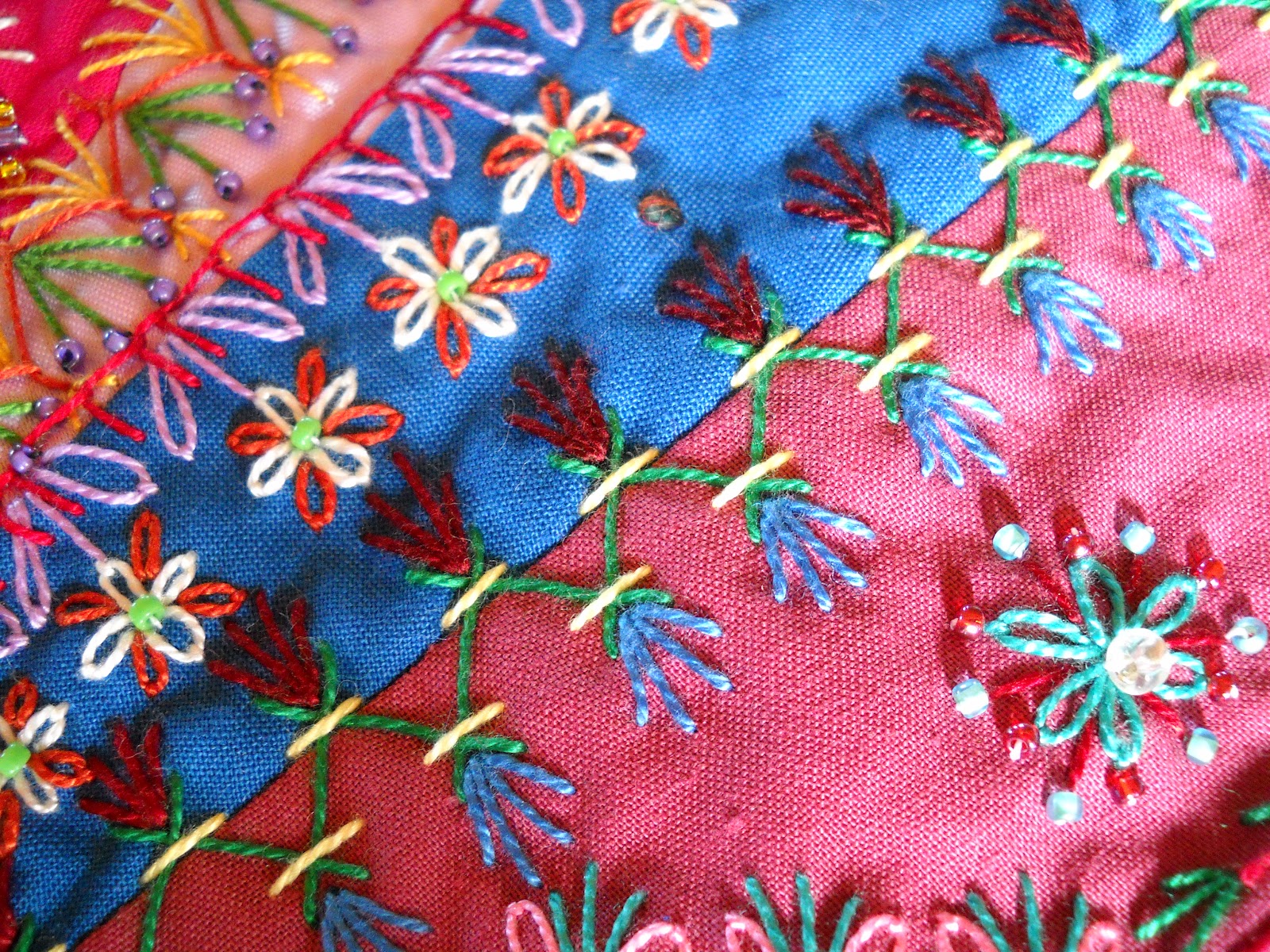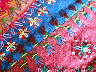 HOLY COW! This is awe-inspiring. I have always wanted to make a crazy quilt, but I can't figure out how to start. This is wonderful, not only is it a crazy quilt, but then it is embroidered too. WHO DOES THAT?!?!?!? I LOVE THIS!