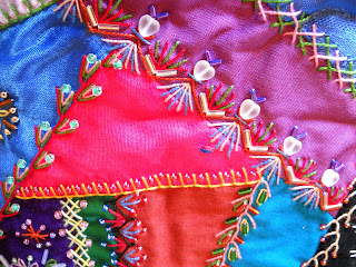 fabric is covered in roving wool, and snippets of glittery snowflake ribbon. I