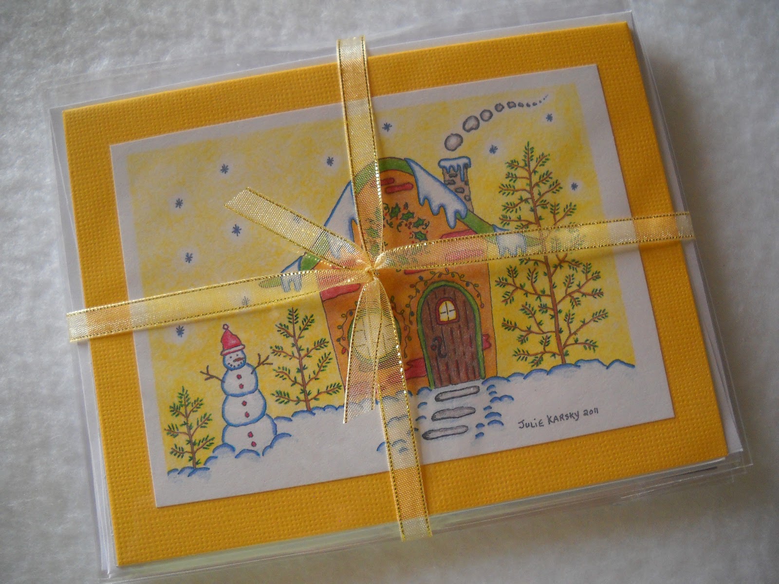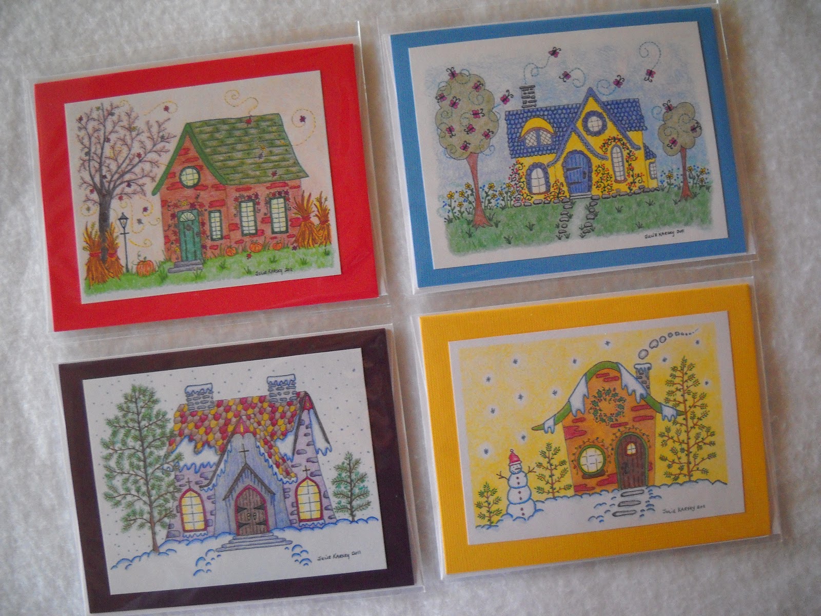 with a matching white envelope. They come in sets of 4 cards, each with a different image. Each card