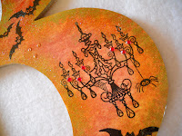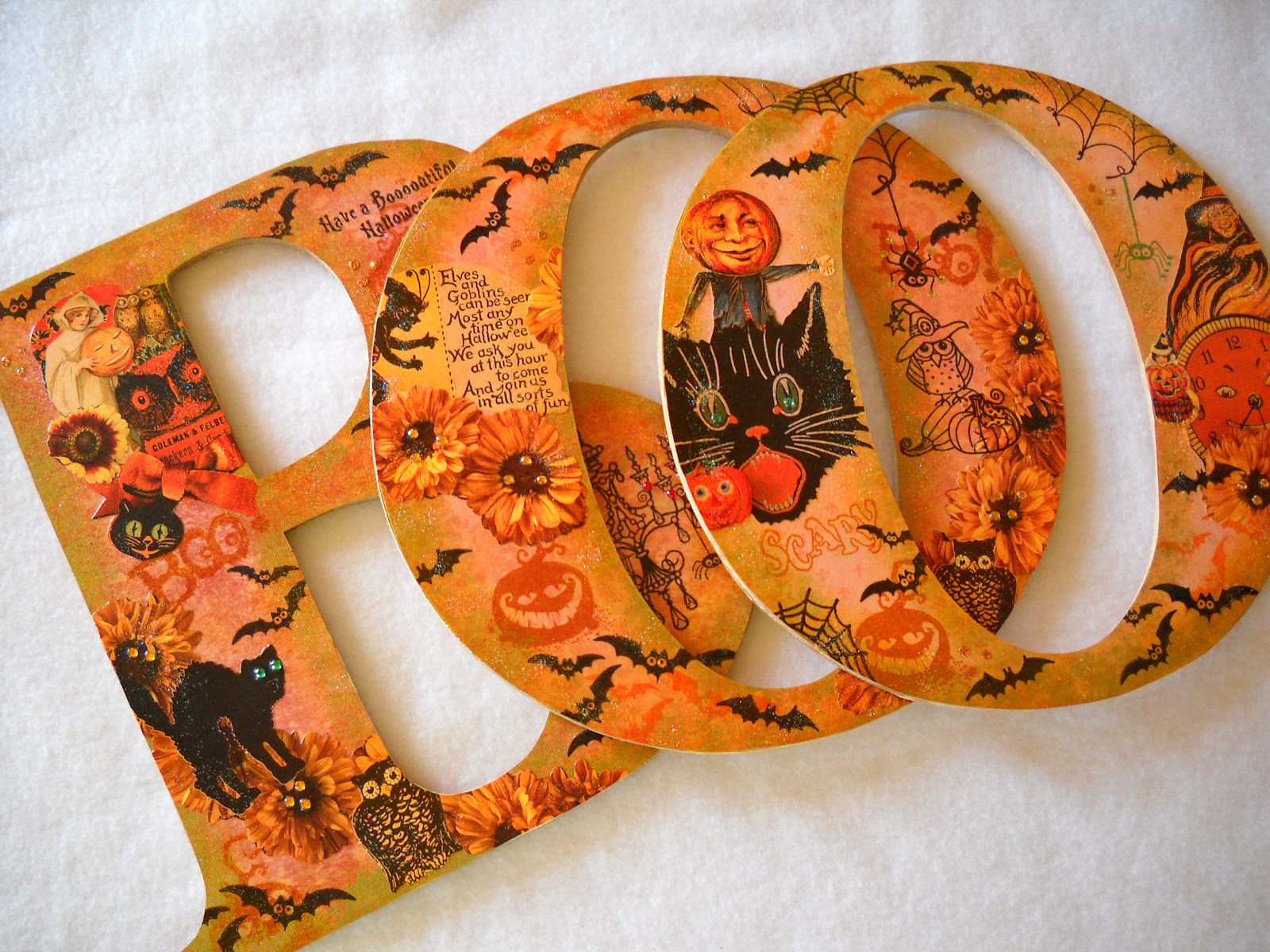 Halloween has come and gone, but I wanted to share with you some wooden letters I made. Each letter is 9 1/2 inches high and ¼ inch thick. Once I covered my letters with paper, I decided on a Victorian theme. I inked the edges with metallic paint just to get the background prepped for all the embellishing I was going to do. I stamped bats, pumpkins and spider webs to create an interesting background. I had an old Victorian calendar, so I hand cut some of my favorite images out of the calendar pages and placed them at random on the letters. Then I glued them in place. It was really starting to look interesting. I decided I needed some scary spiders to go with the spider webs, so I stamped them on. It was time to coat the letters with Mod Podge. When they were still wet, I sprinkled them with sugar glitter. When dry I added dots of glitter glue and then some sparkly rhinestones. They were sealed with acrylic spray.