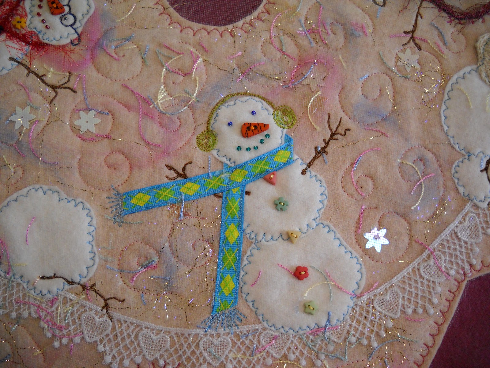 of tulle. The snowmen are appliquéd in place and embellished with thread