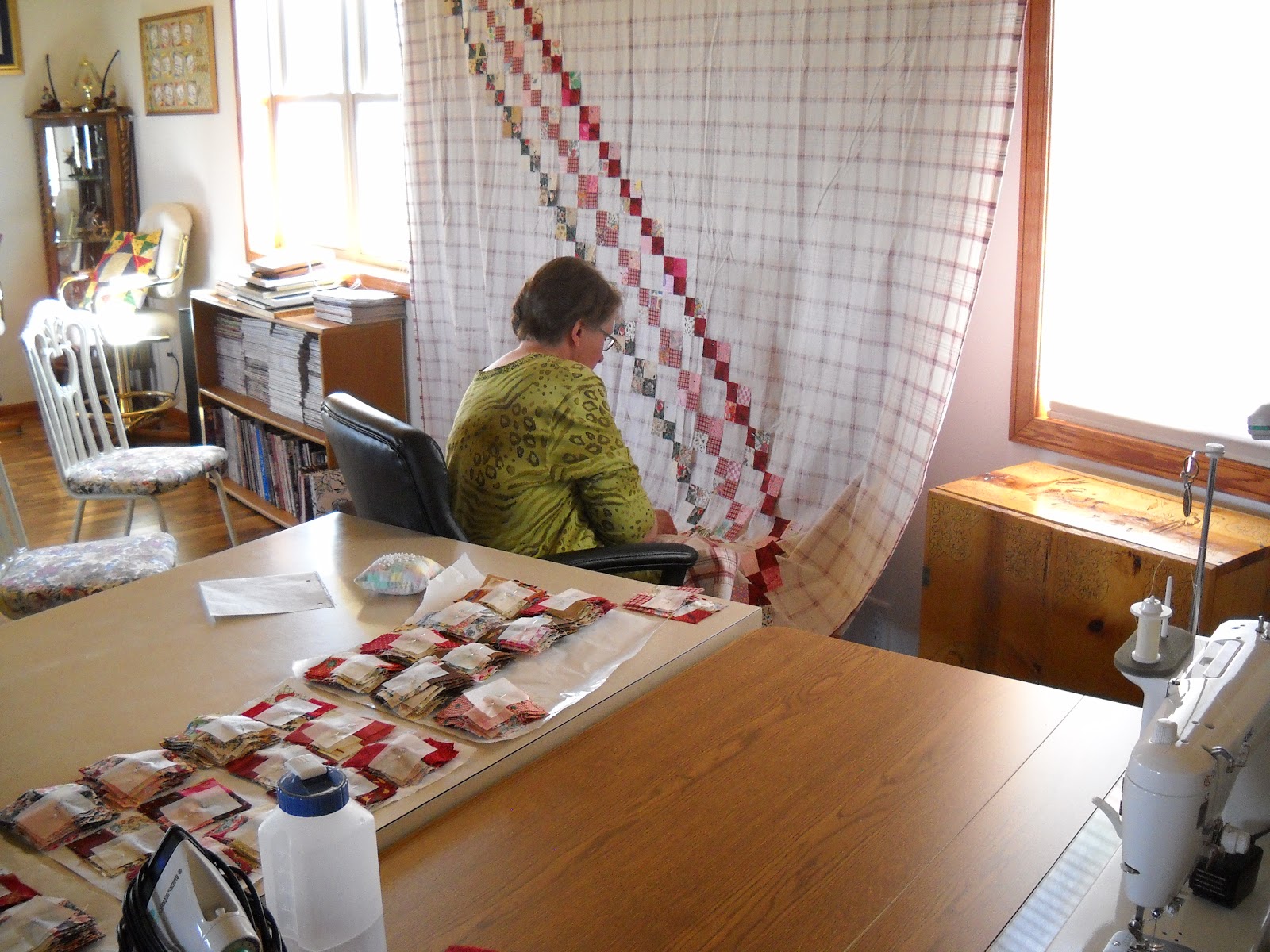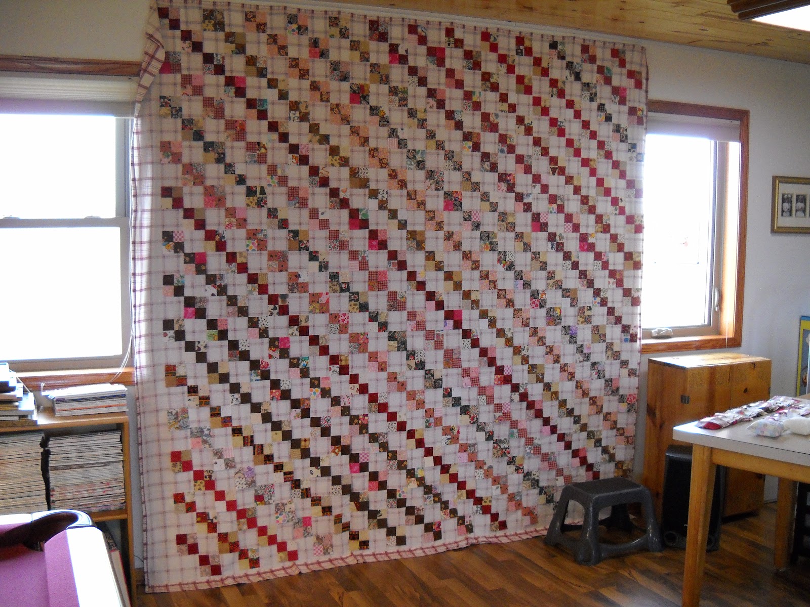 from scraps, so I sewed them into 4 patch blocks. Here I am pinning them to a