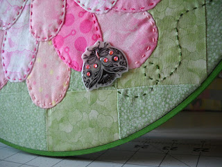 I decided on the Lady bugs in the end, and I attached them by sewing them on with Pearle cotton thread. Then a little hand embroidering and the piece is coming together very nicely, I think.