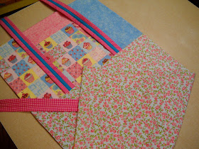 I found this adorable fabric at the craft store. It has cupcakes printed on it, so using that as a theme for one of my bags seemed like a great short project. Selecting the fabrics for this project was a joy. I picked the softest pastels to go with the theme fabric and one bright pink for contrast. For the lining of the bag I chose a piece of fabric that had small pink flowers on it that was a coordinating print to the cupcakes fabric. To add a little extra to the project I picked up some cupcake buttons.