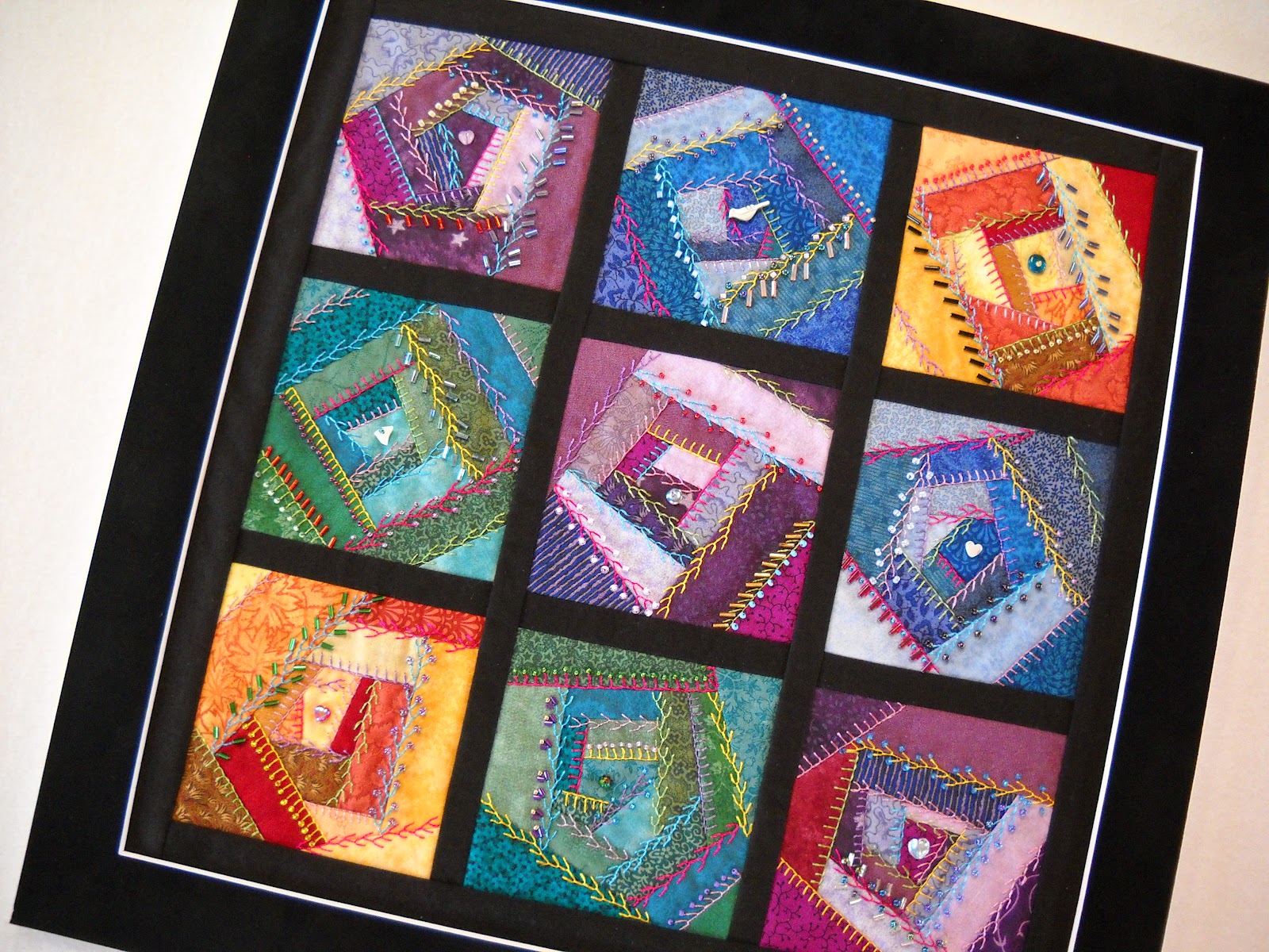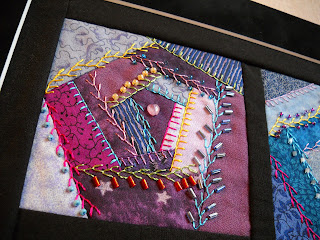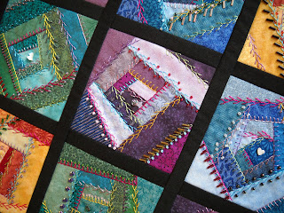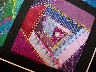 As you can see the little blocks are heavily embellished with glass beads. I chose a variety of bugle beads and seed beads, and then added tiny glass buttons, stones and a Mother of Pearl bird. If you were interested in buying this quilt project you can contact me at:   juliesoodlesofdoodles@mail.com