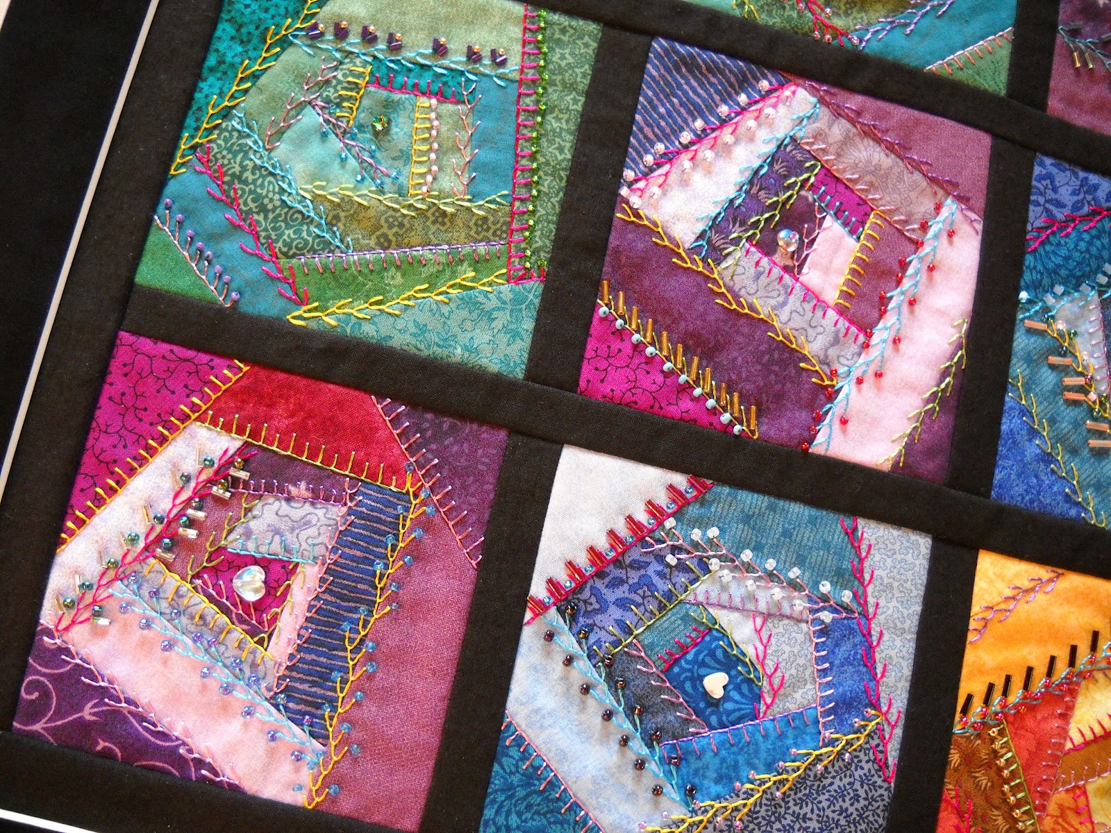 fabrics in those tones for each block. I then chose to use rayon embroidery