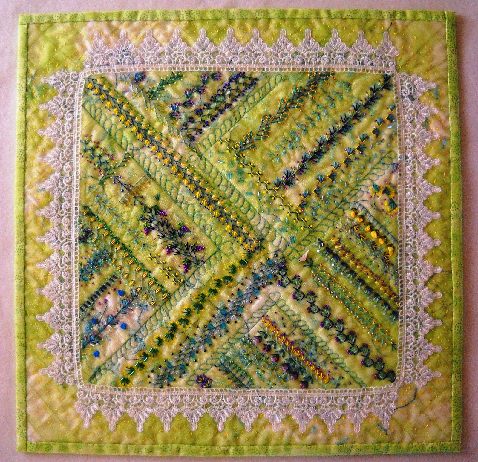 Once the fabric was stable, I was able turn my attention the hand embroidery work. Following the diagonal lines that I had sewn on the base fabric, I used various embroidery stitches and pearl cotton threads.