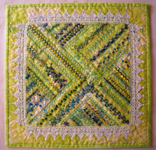 With the stabilizer gone I had a nice piece of fabric to work with. I backed it with some cream colored felted wool, and   placed it on my cutting mat. With the help of rulers I positioned a beautiful lace around the outside to create a border on my quilt. Then I covered the entire piece with another layer of white bridal tulle that had a little sparkle. With all the layering in place, I stitched over the lace with white thread to hold it down where I wanted it to stay.