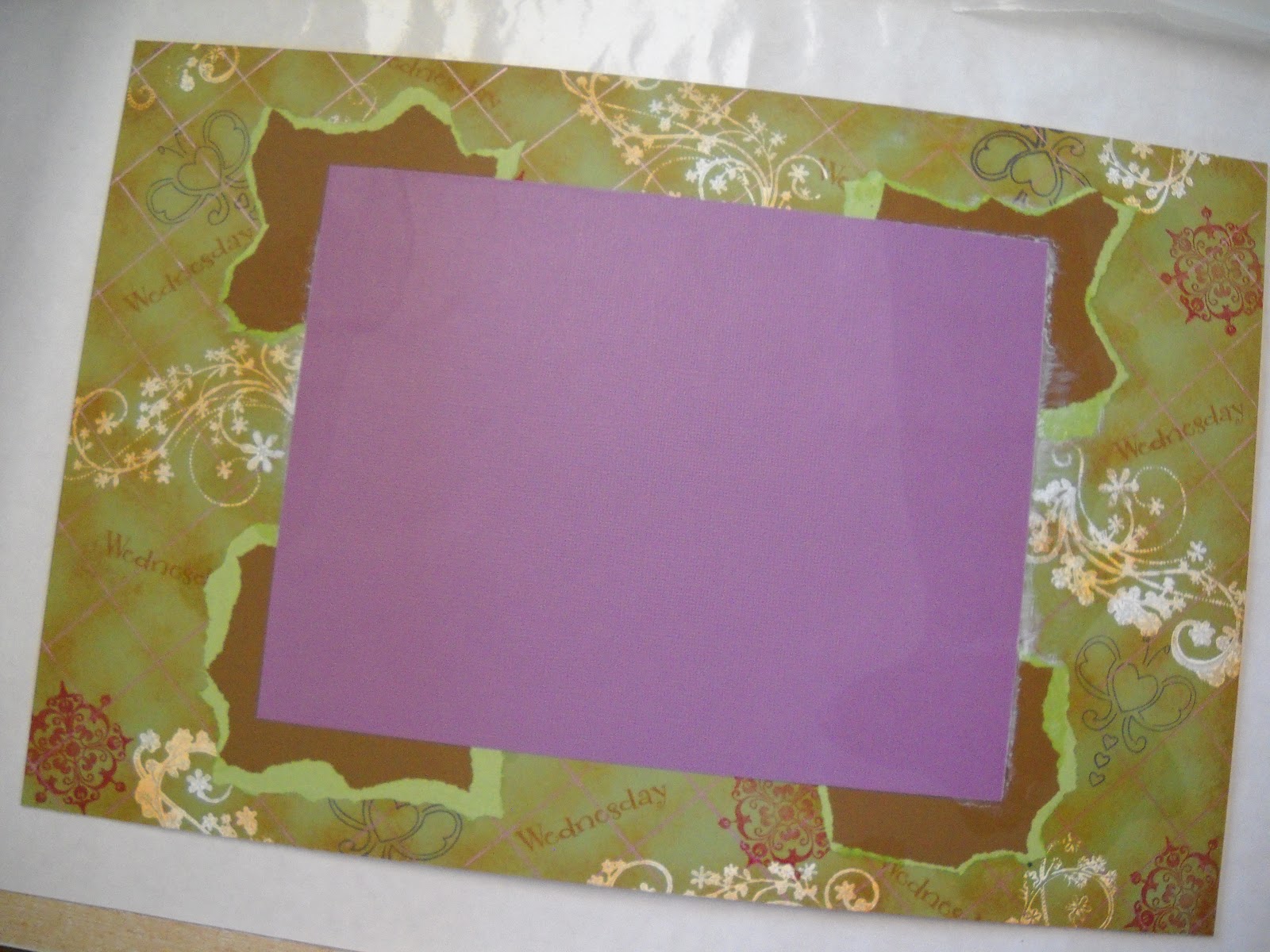 For the final assembling of the center piece, I placed my butterfly art over the purple paper and everything was glued down and pressed with a stack of books.