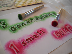 Once everything was glued in place, I stamped in the words: Grandpa, Son, and Grandson and some pretty swirls with some stamps I had on hand. I then coated the entire surface with paper glaze. While it was still wet, I sprinkled some very fine sugar glitter over the glaze.