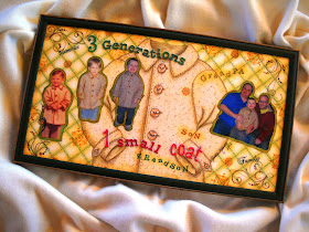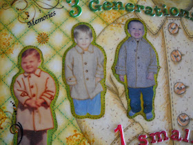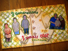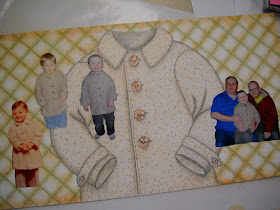 Well, I finally have some time to share the process of making this collage for my husband, Joe. When he was very small his mom dressed him in this little coat, and took a picture. He received the coat from his mom, and when we had our son Joseph, we too dressed him in the coat and took a picture. The little coat was then given to our son, and when he had his little guy, Tommy, he also wore the coat. This small coat has been around for fifty years now. We all refer to it as the “oatmeal coat” because the fabric looks like oatmeal or malt-o-meal hot cereal.