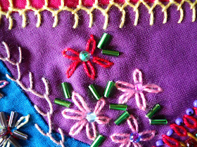 I love the way the green bugle beads show up on the purple fabric. The nice part of a project like this is that you get to play with all sorts of color combinations.