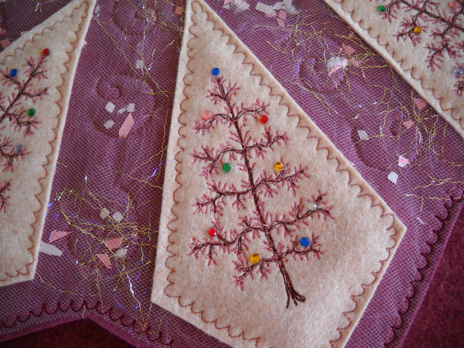 fabric is covered in roving wool, and snippets of glittery snowflake ribbon. I