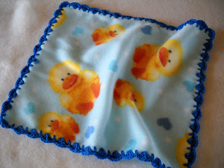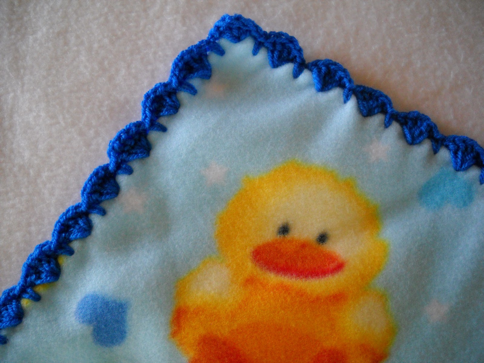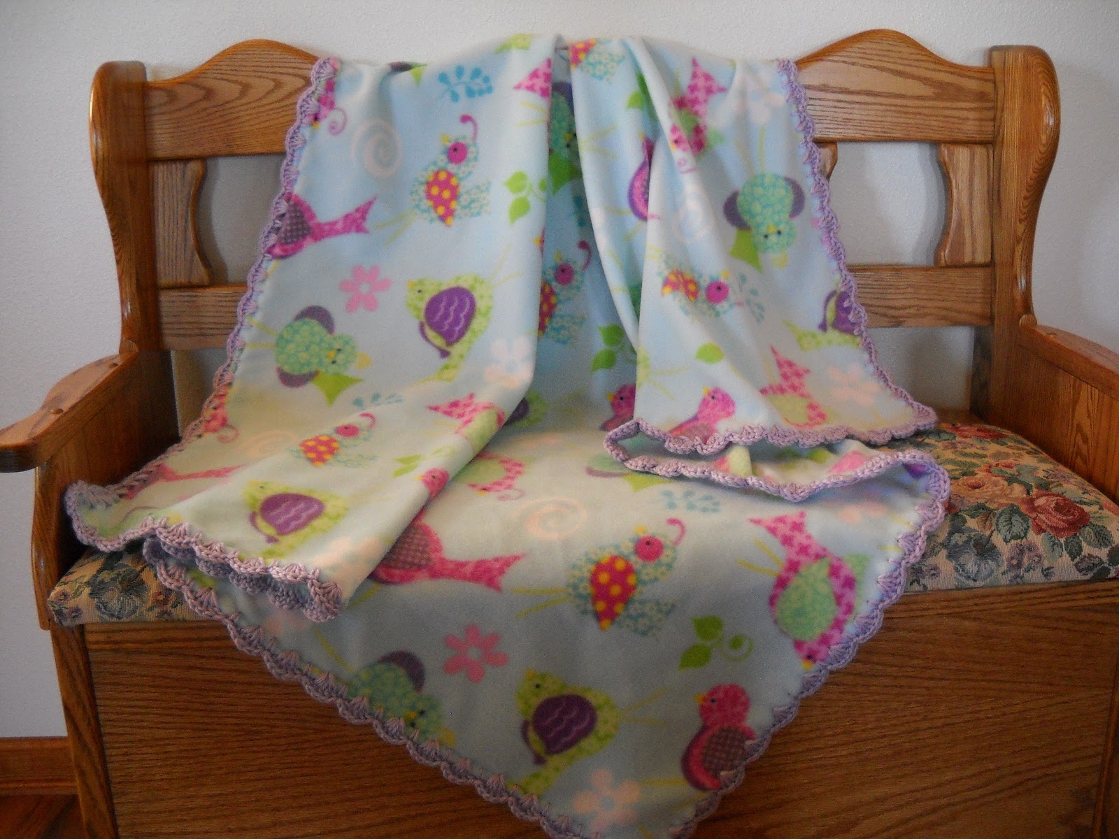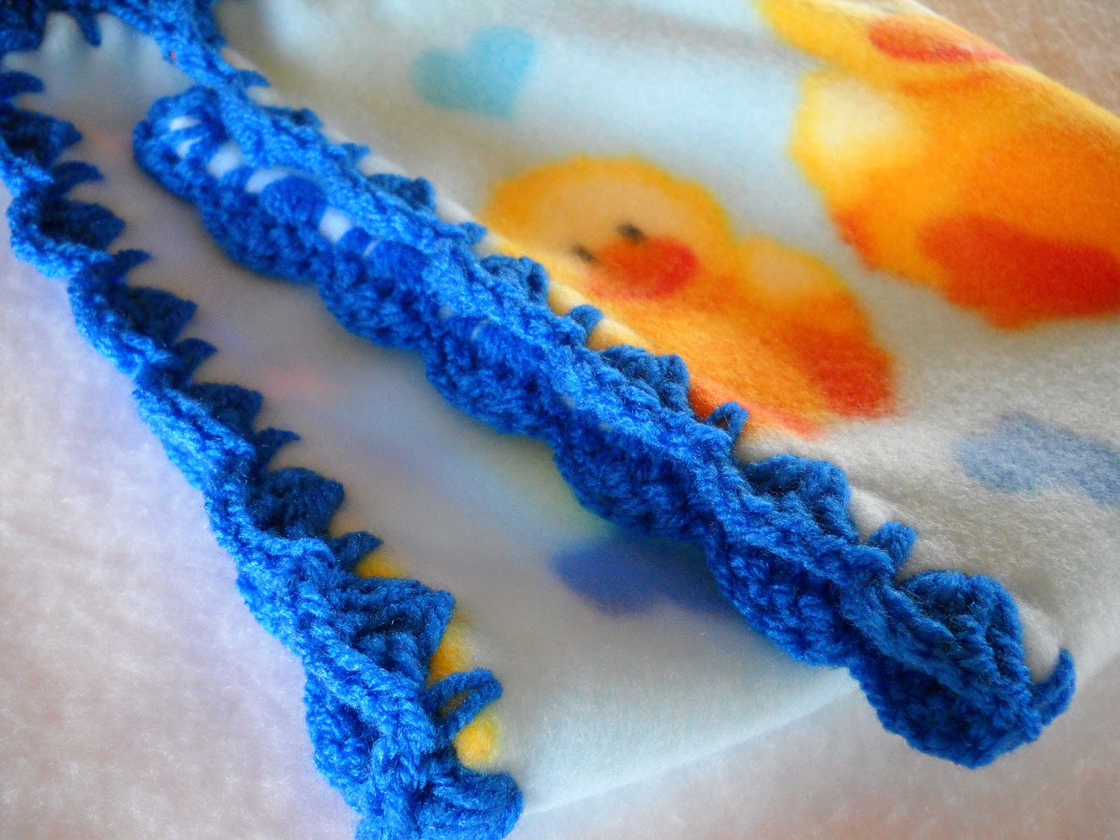 fabric. I added a beautiful blue ruffled crocheted edge to give the blanket