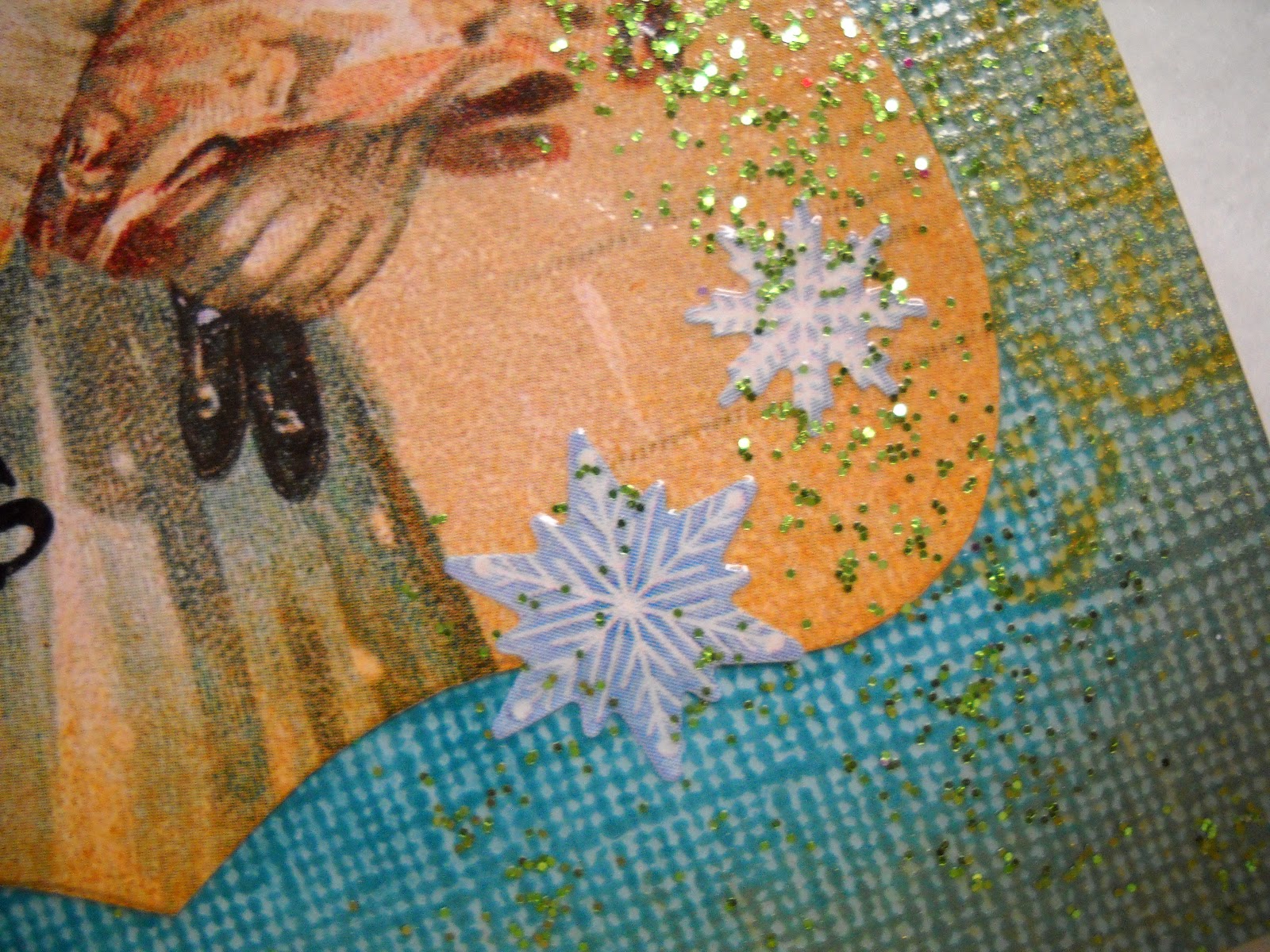 The edges are hand inked and stamped to enhance the background paper. I hand cut my recycled image and applied it to the card. Additional inking was then done to give it an aged look.