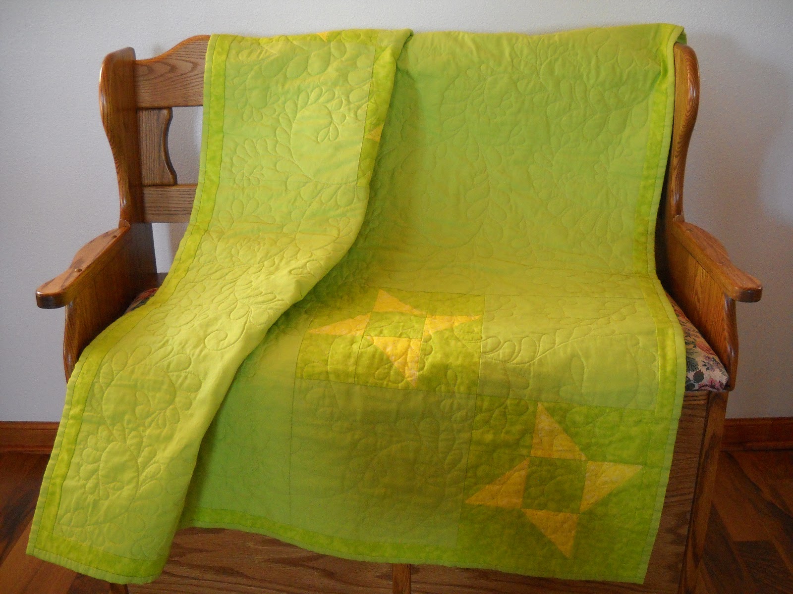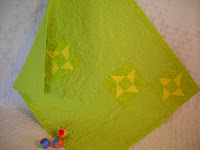 This is a lovely pieced lime green quilt with yellow pinwheels. I used Kona cotton on the front and back. The batting is 100% cotton. It is machine quilted with feathers throughout the top. The binding is hand stitched. After finishing the quilt it was washed and tumble dried on low to give it that crinkled look you get after washing an all cotton quilt. This quilt measures 44 ½ X 38 inches. All of the items I create are made in my pet free, smoke free home studio.