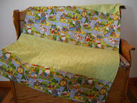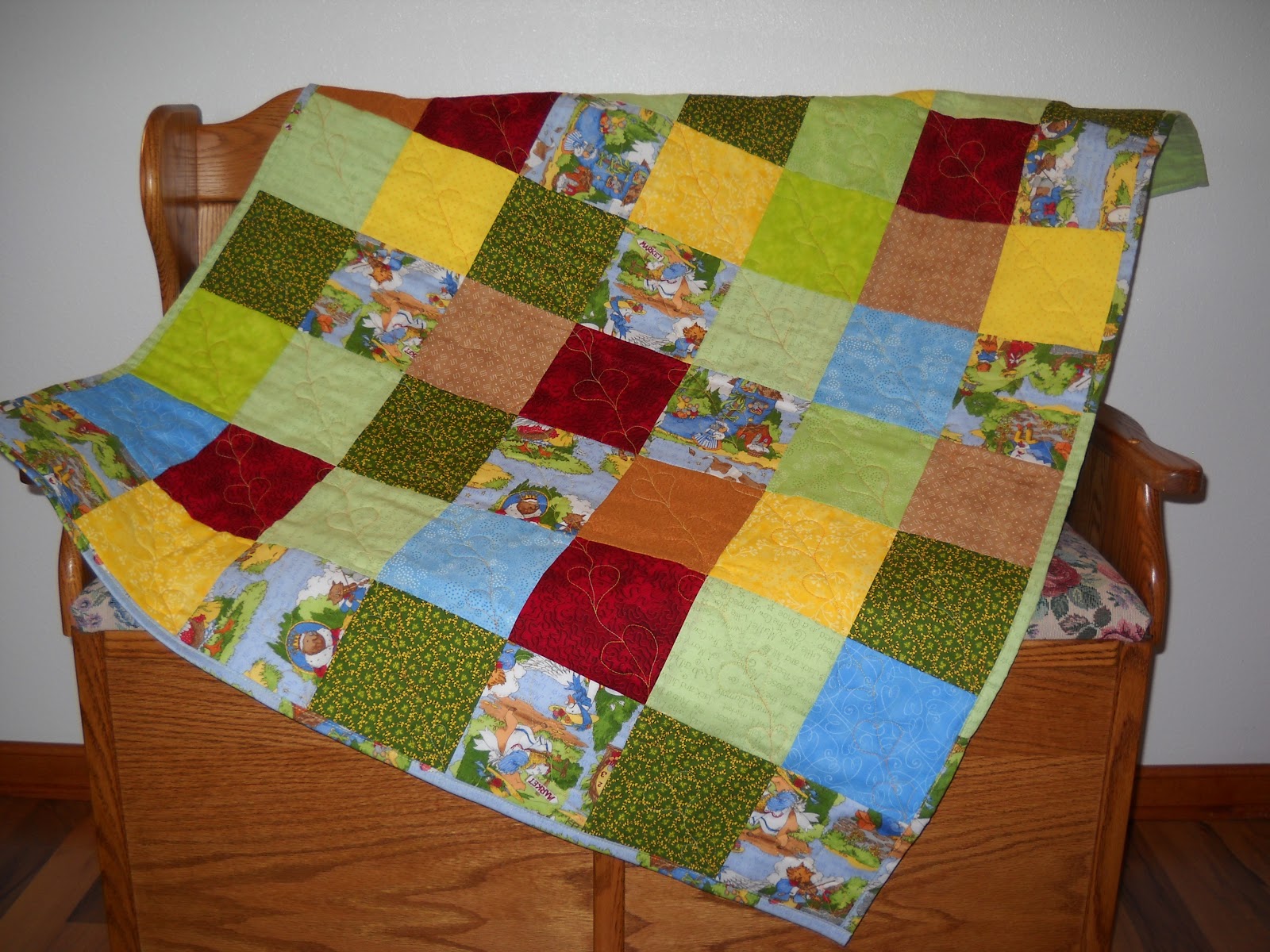 This would be a fun little quilt for a boy or girl. It is very cuddly and soft. The fabric on the top of the quilt is quality quilter’s cotton and I used a soft cotton flannel check on the back. The quilt is machine quilted with a meandering stitch and 100% cotton batting. This quilt measures 41 X 34 inches. All of the items I create are made in my pet free, smoke free home studio