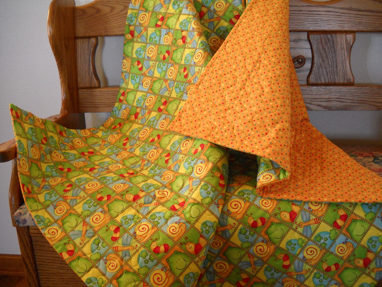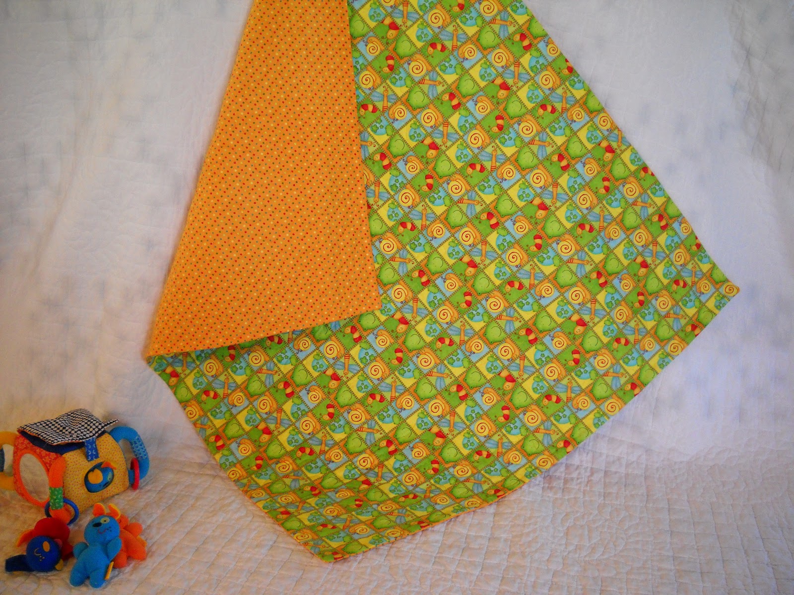What baby wouldn’t want to cuddle up in this bright and cheerful little quilt. The print fabric on the front of the quilt has snails, frogs and butterflies. The backing fabric is a coordinating print of bright little polka dots. I used quality quilter’s cotton fabrics and a cotton batting. The quilt is machine quilted with a meandering stitch. This quilt measures 42 X35 inches. All of the items I create are made in my pet free, smoke free home studio.
