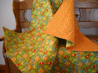 printed fabric and coordinating prints. The back of the quilt has a pieced