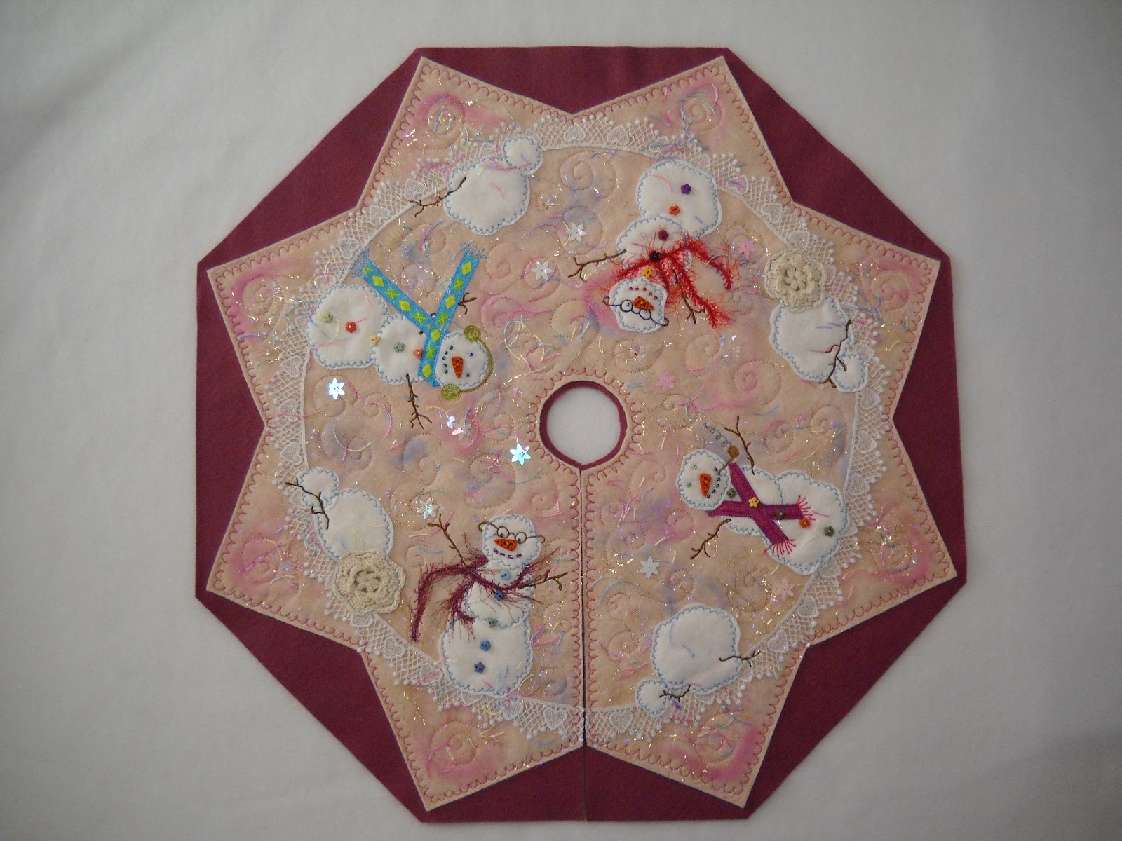 of tulle. The snowmen are appliquéd in place and embellished with thread