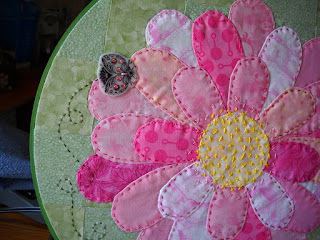 I decided on the Lady bugs in the end, and I attached them by sewing them on with Pearle cotton thread. Then a little hand embroidering and the piece is coming together very nicely, I think.